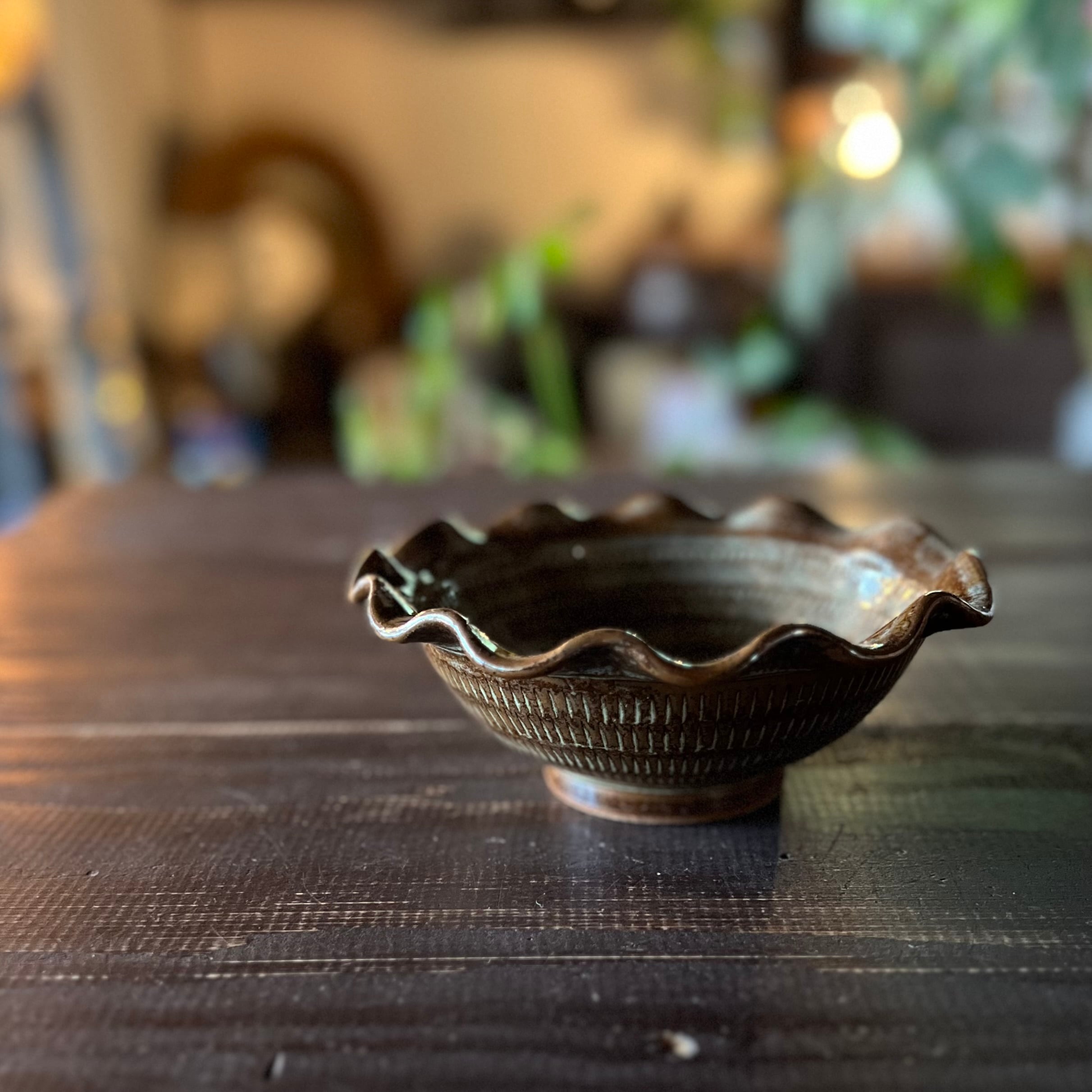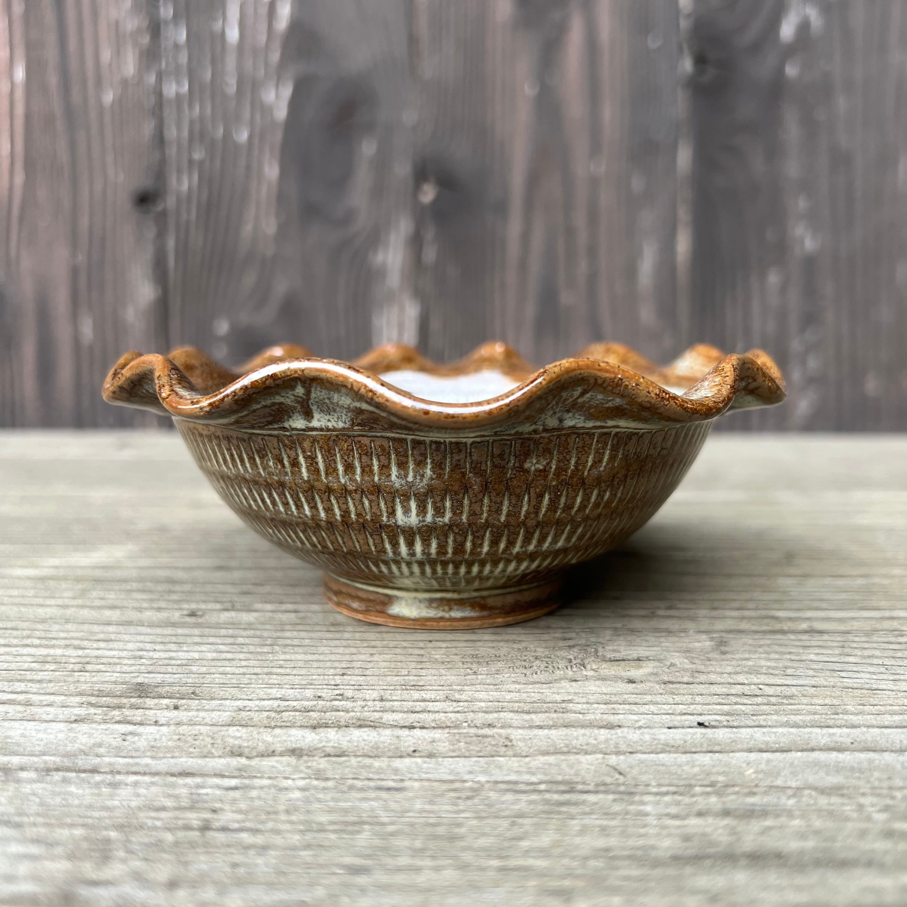 ふちがふわりと波打つ、フリルのような縁が印象的な小鉢です。
