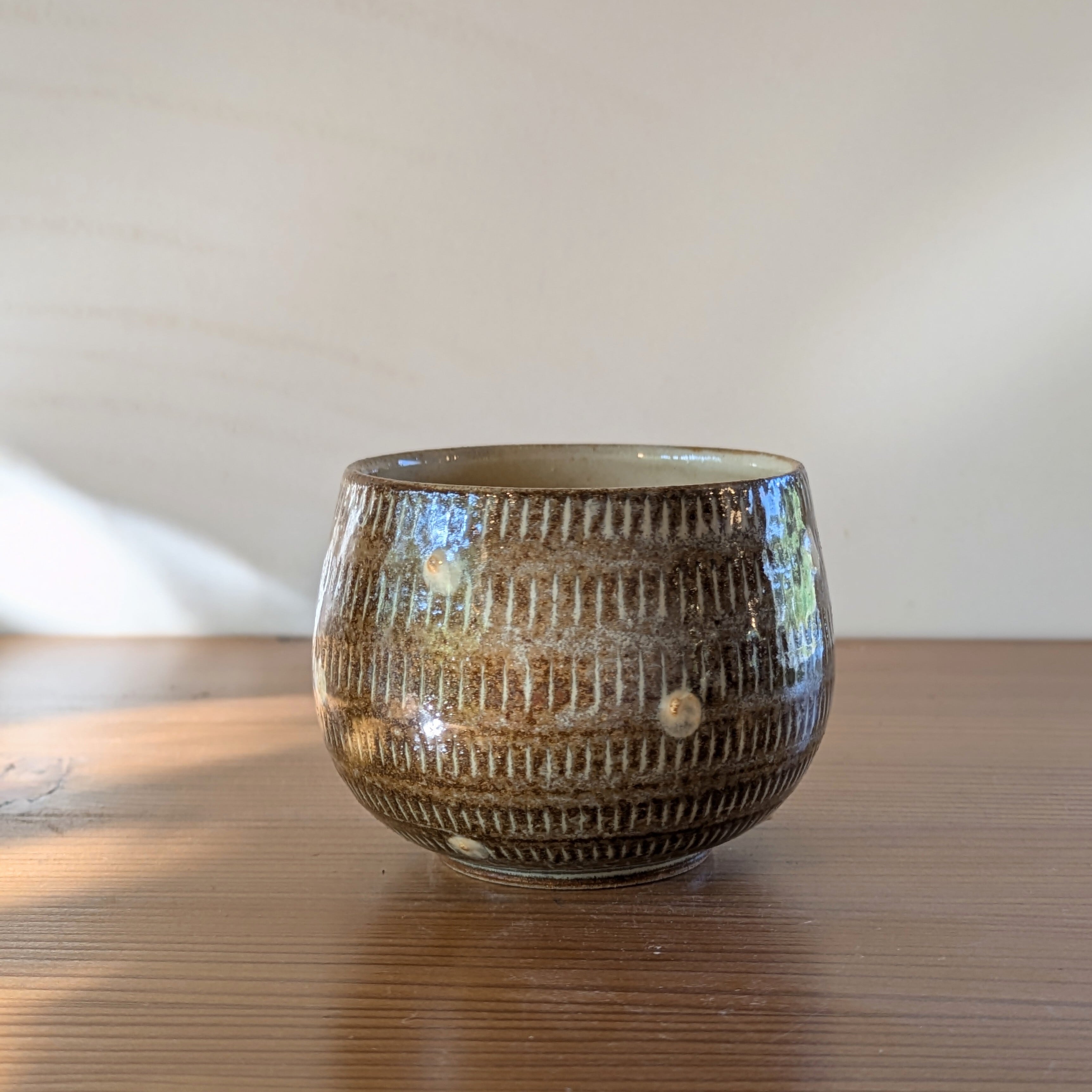 器の肌に細かいひびのような模様は貫入といって、陶器の表面の小さな隙間にお茶やコーヒー、