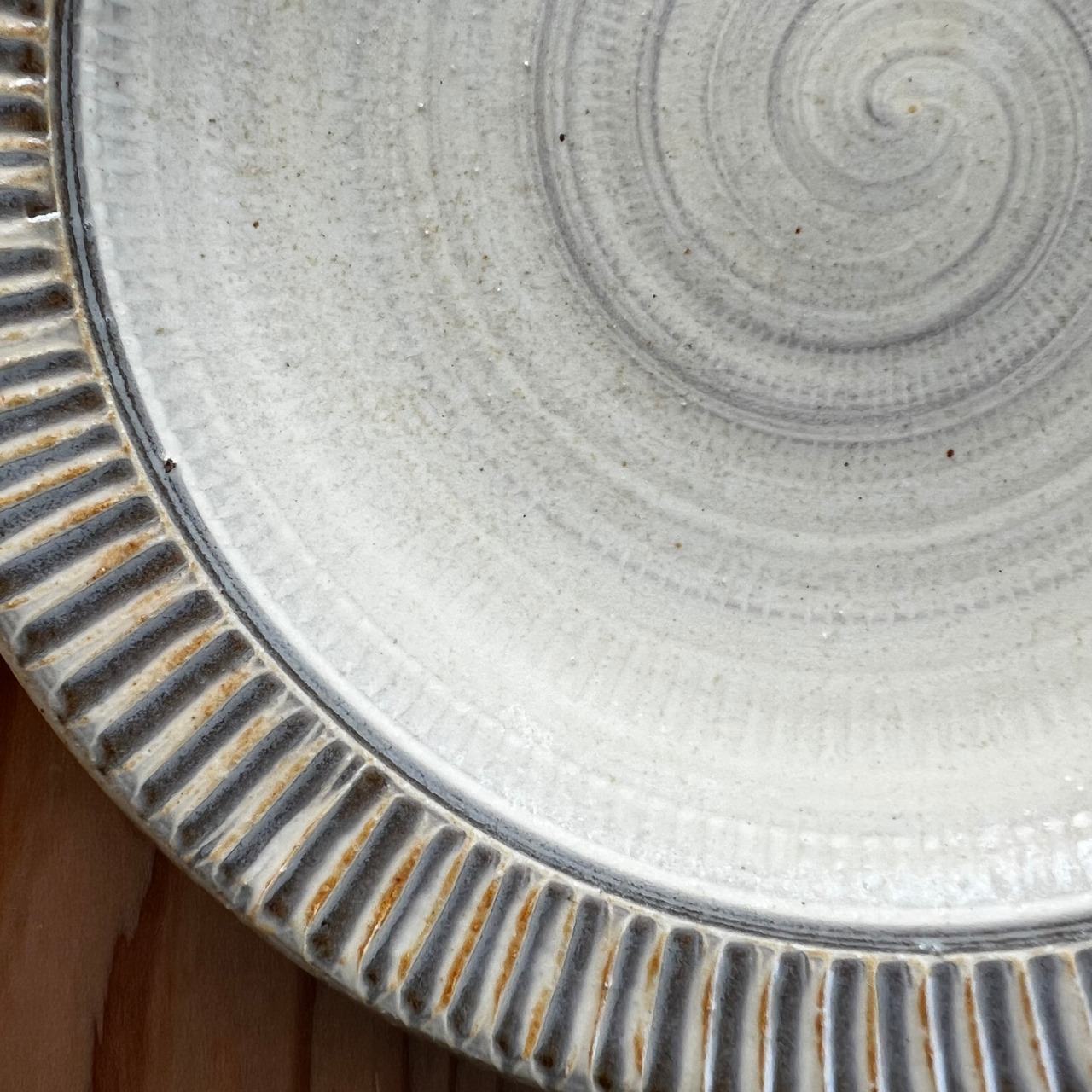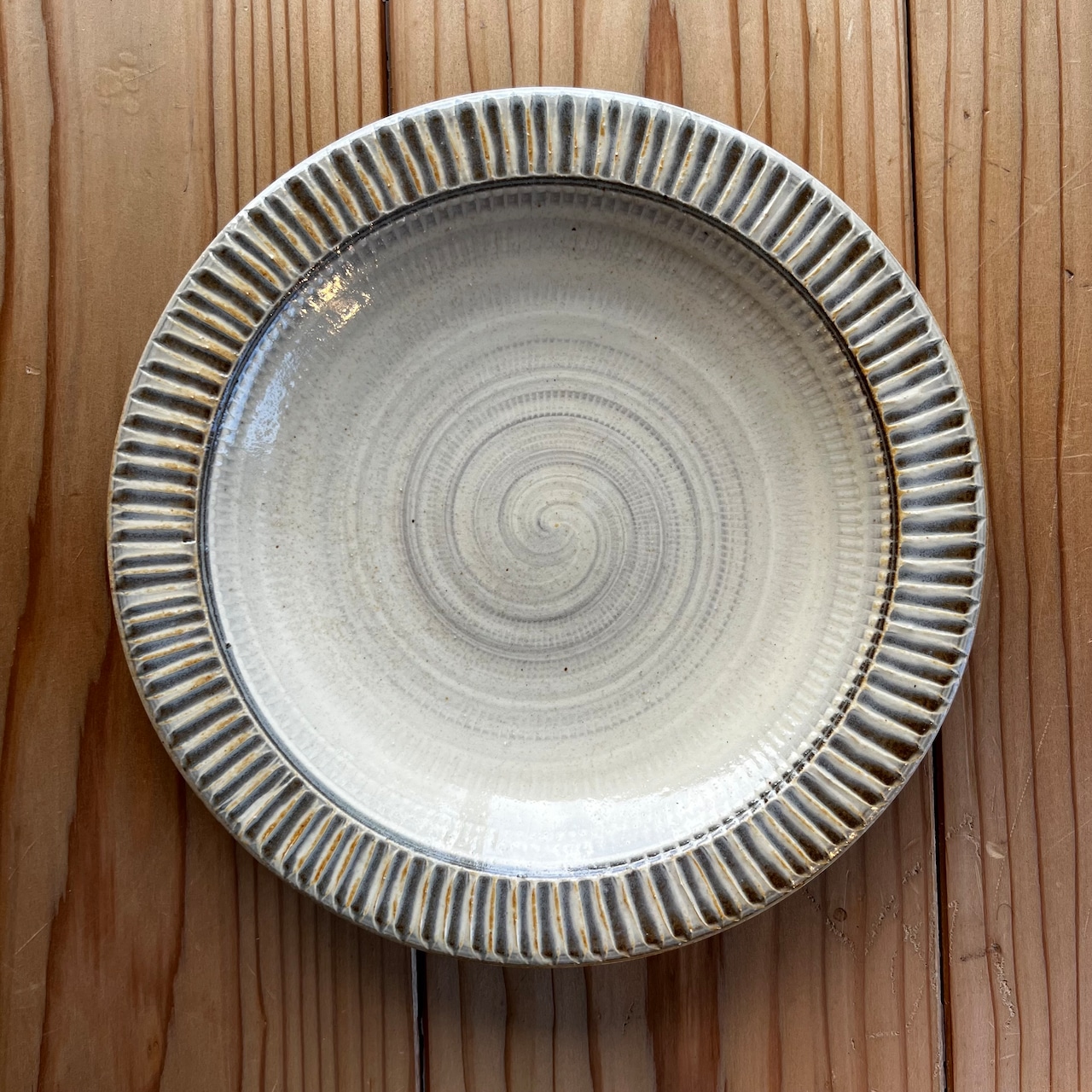 小石原焼特有のとびかんなの地模様の上に、白と茶のコントラストが美しいお皿です。