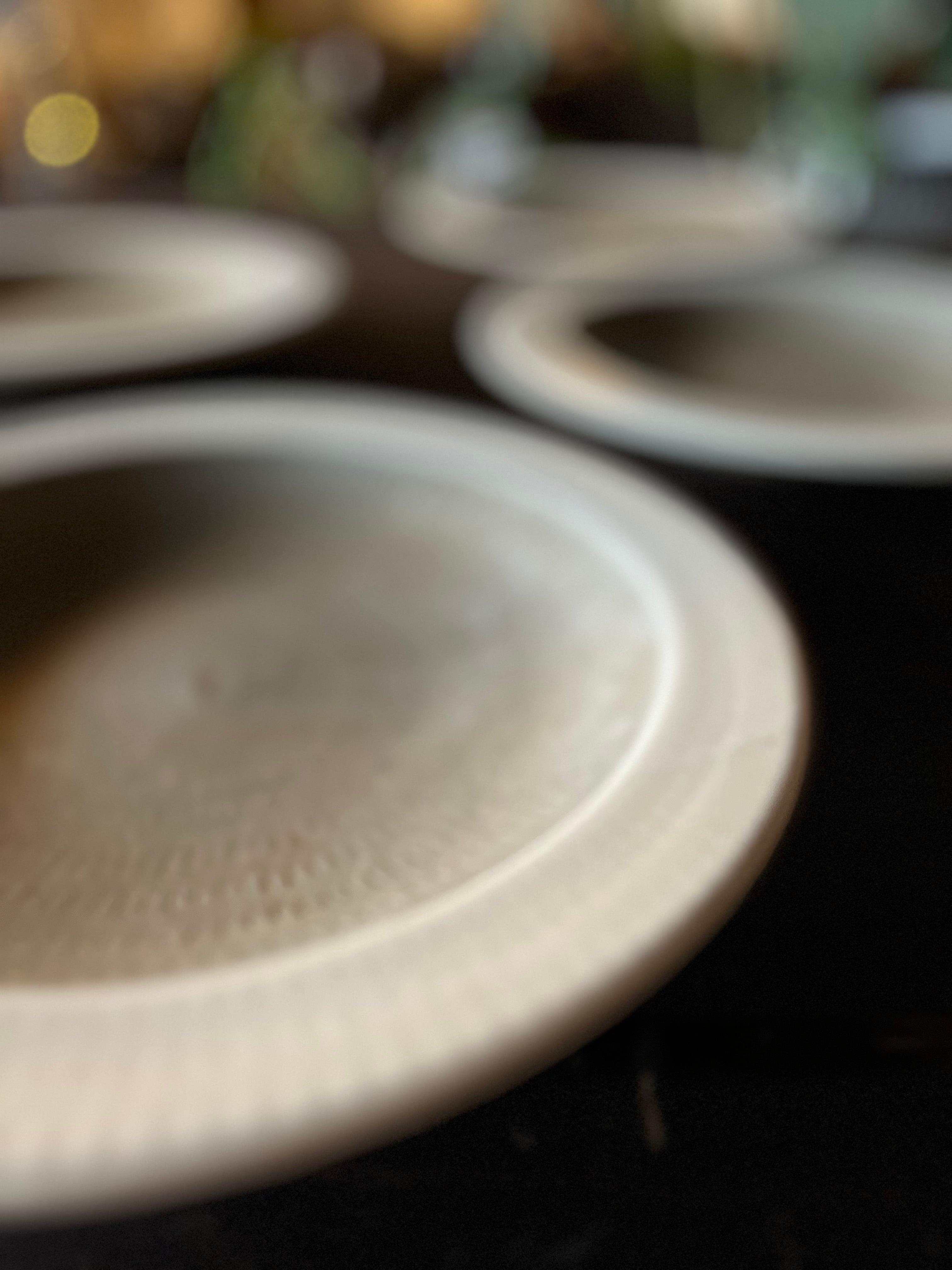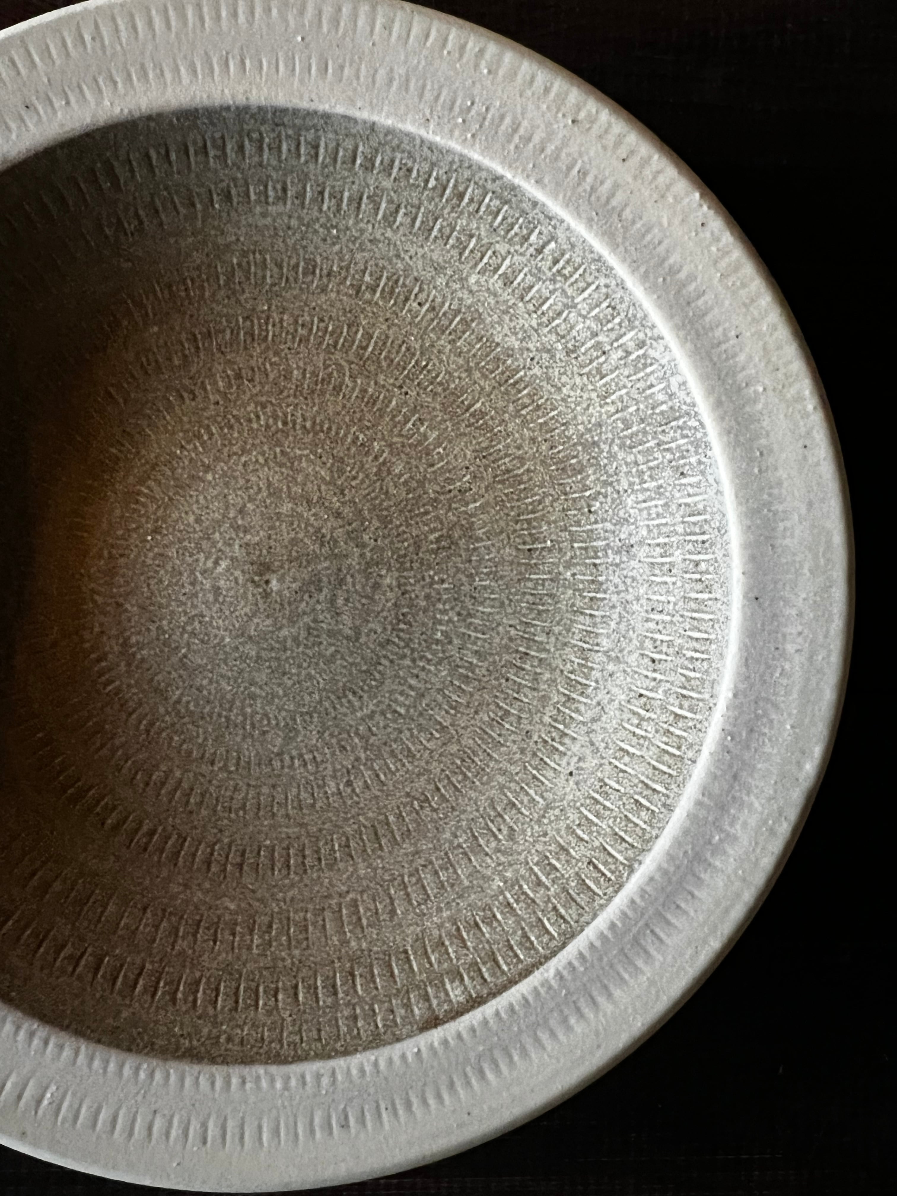 小石原焼特有のとびかんなの地模様の上に、白とグレーのコントラストが美しいお皿です。