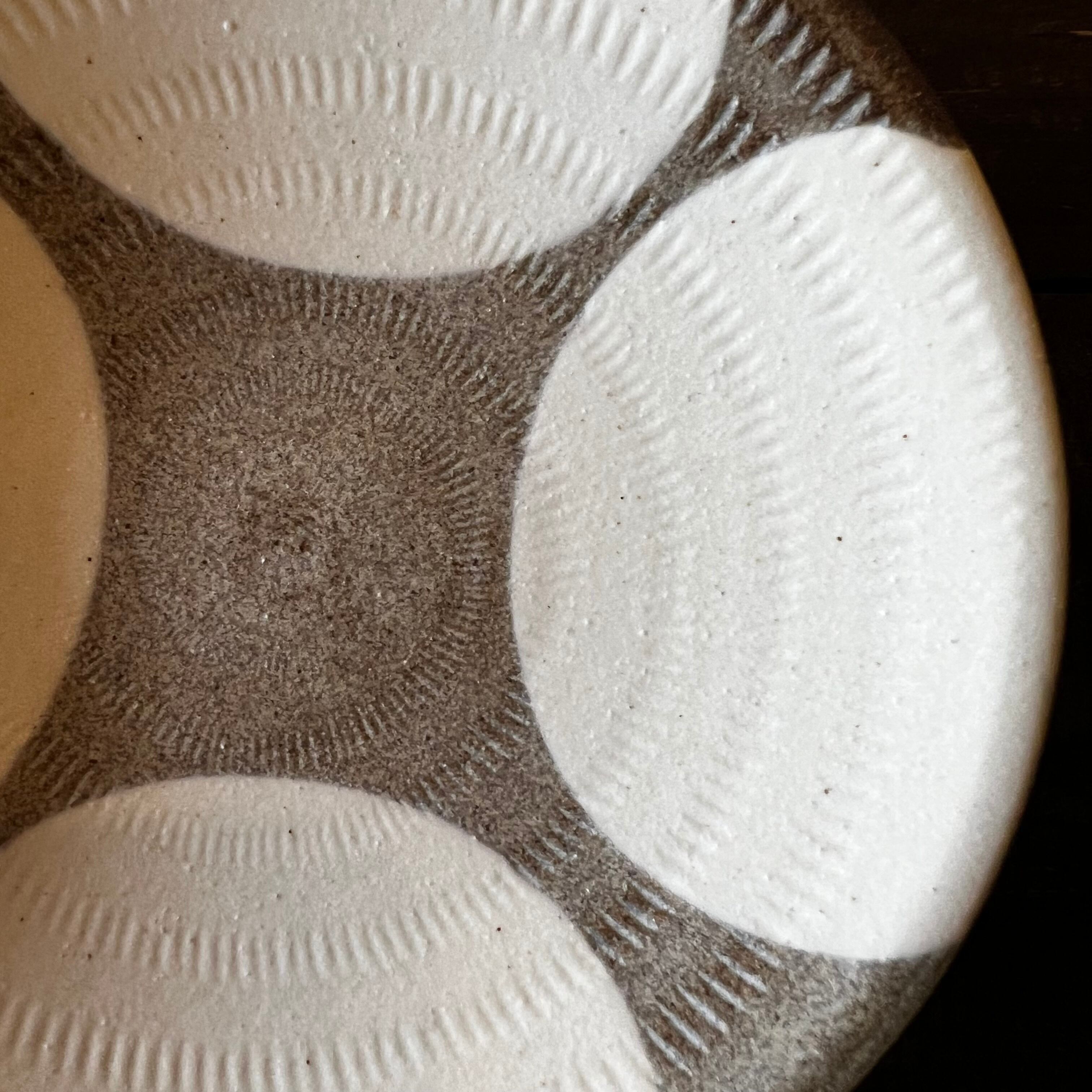 白い化粧土を四方からかけた模様。